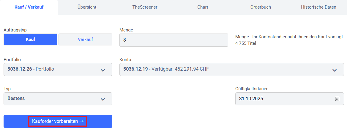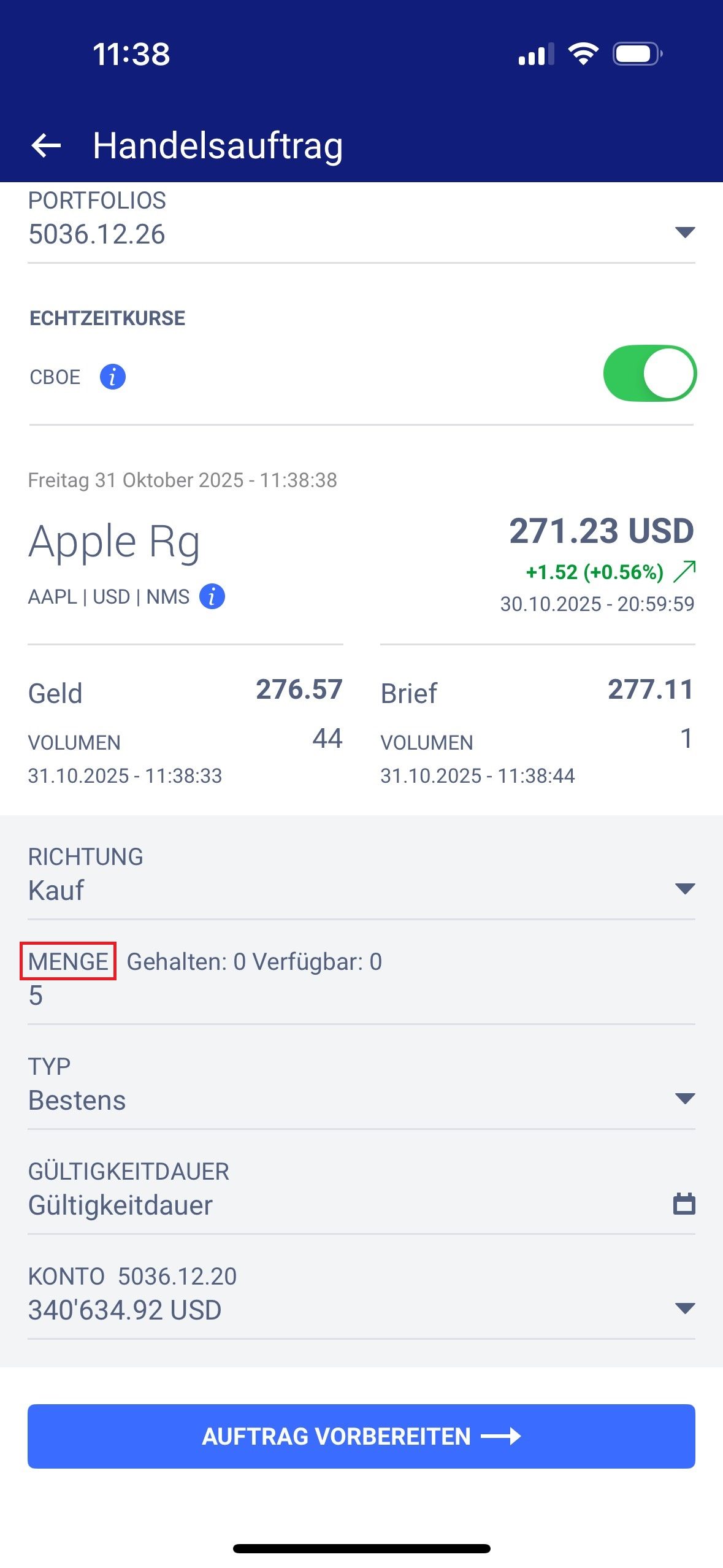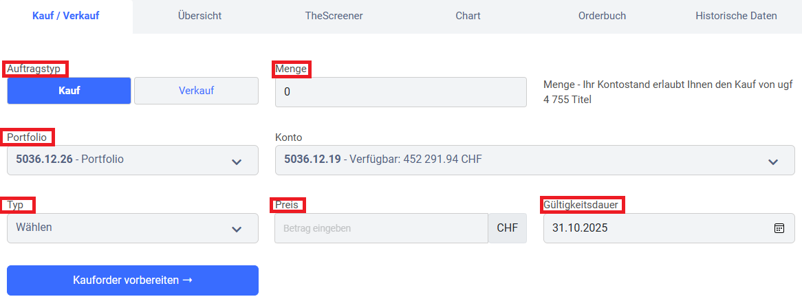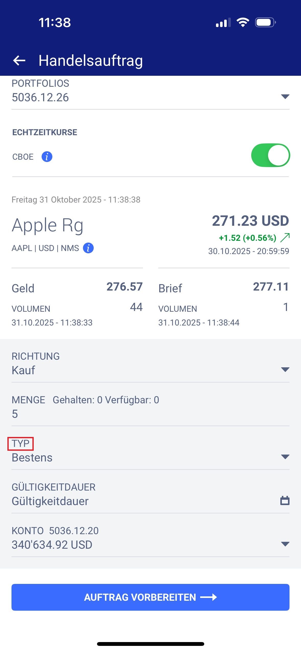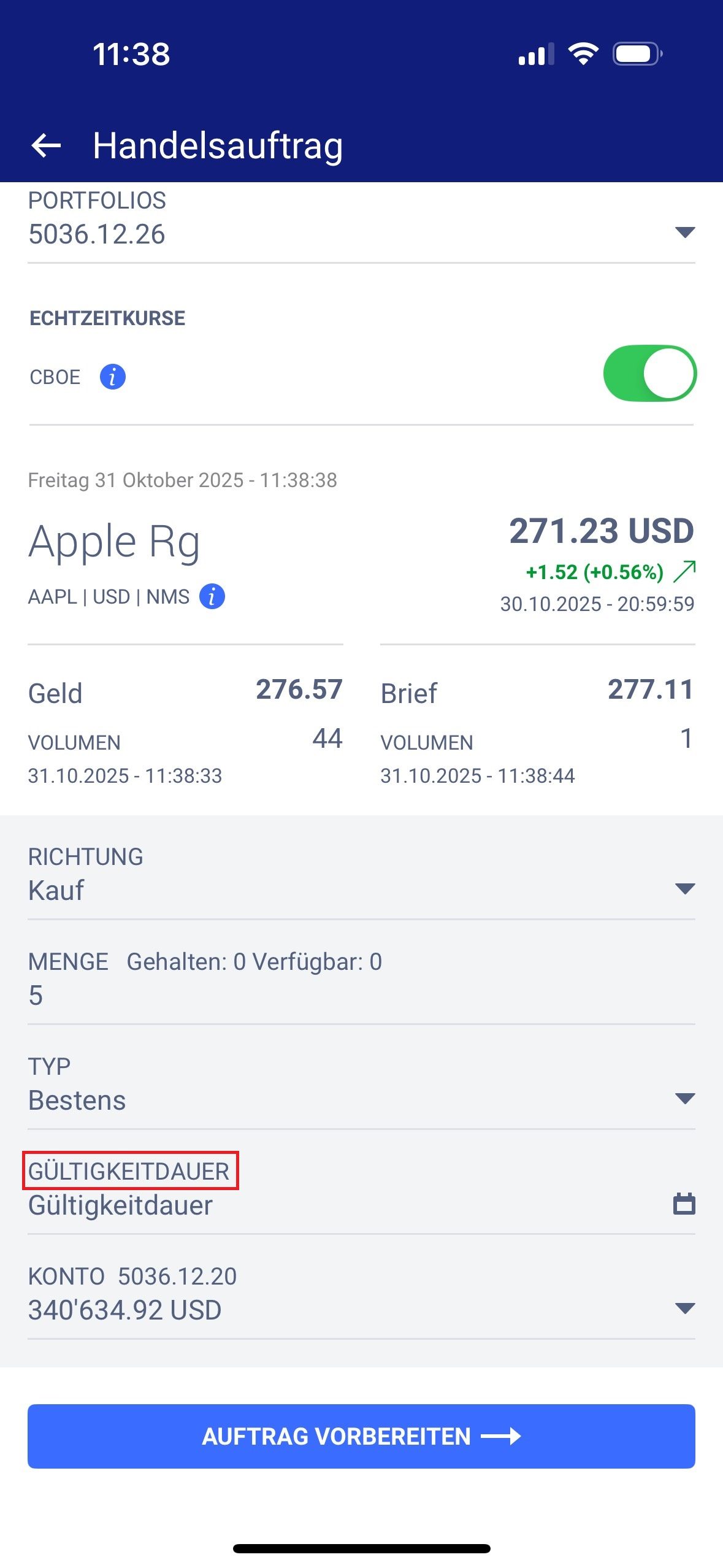 • Füllen Sie die folgenden Felder aus: «Auftragstyp», «Menge», «Portfolio», «Konto», «Typ», «Preis» unter Angabe allfälliger Limiten und «Gültigkeitsdauer».