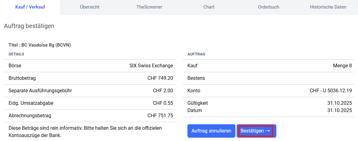 • Klicken Sie darin einfach auf «Bestätigen» und Ihr Auftrag wird ausgeführt.