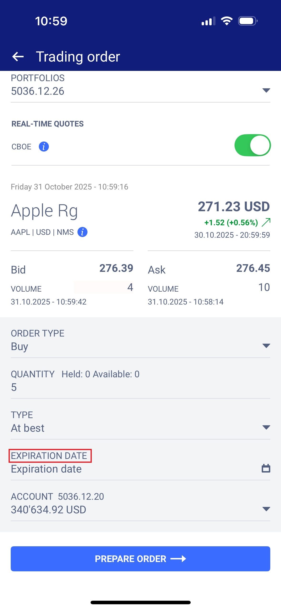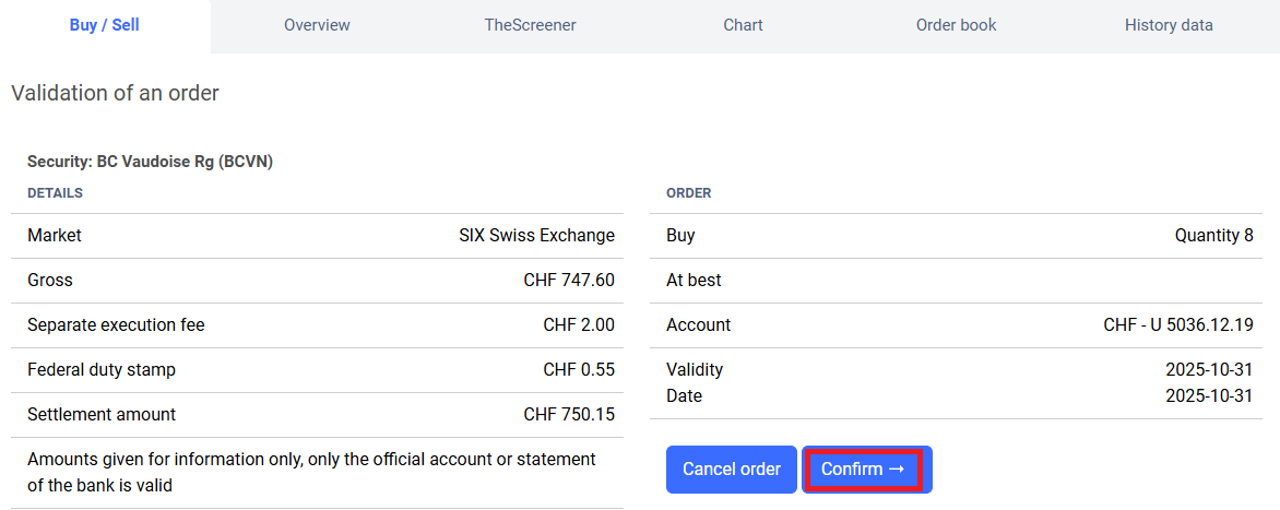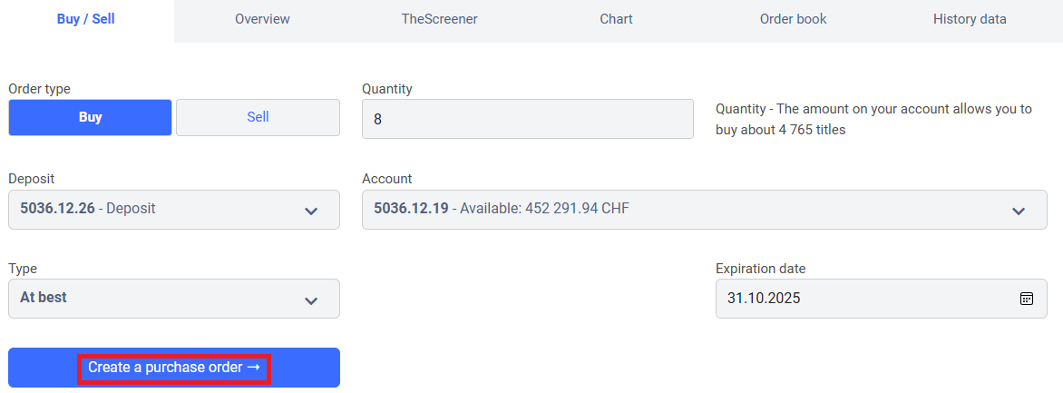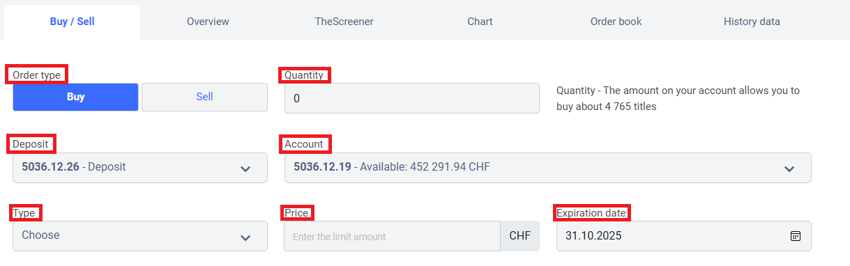 • Fill in the following fields: “Order type,” “Quantity,” “Deposit,” “Account,” “Type” (with limits, if desired), “Price,” and “Expiration date.”